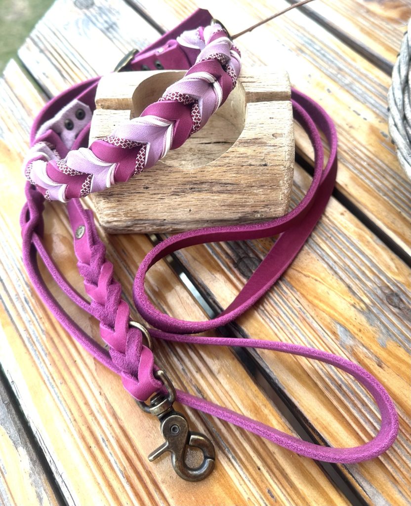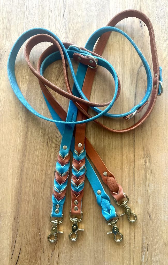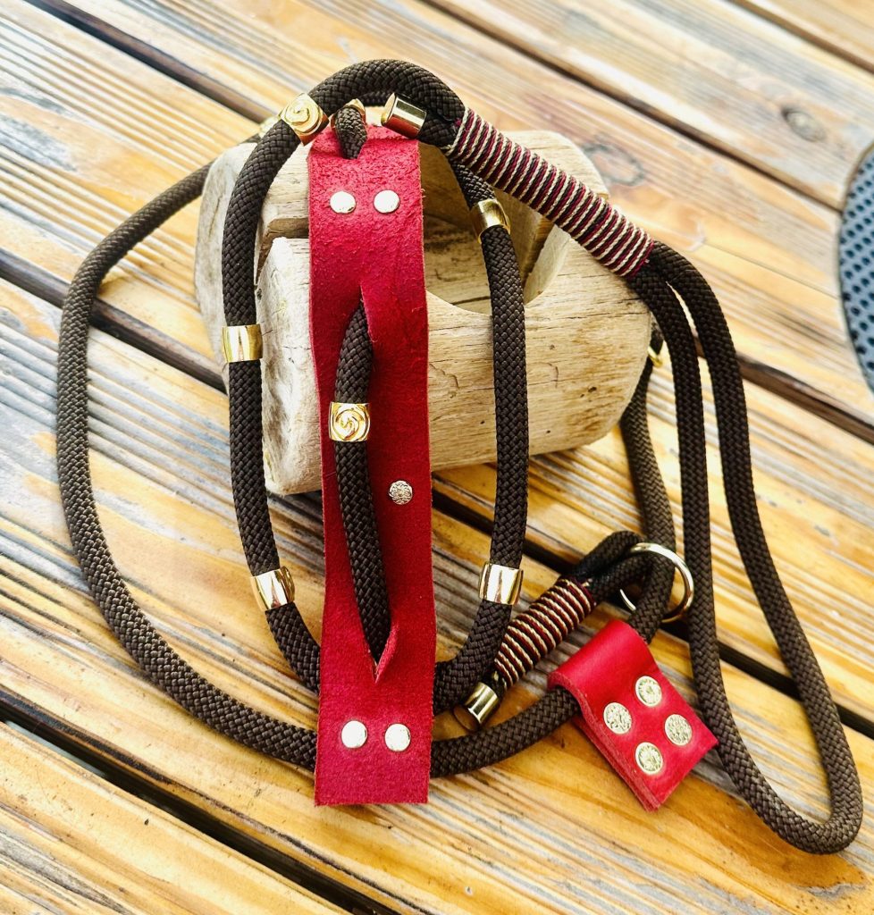 Ich verarbeite verschiedene Materialien z.B. Biothane, Geschirrleder, Fettleder und kombiniere mit speziellem Hundeleinen Seil.